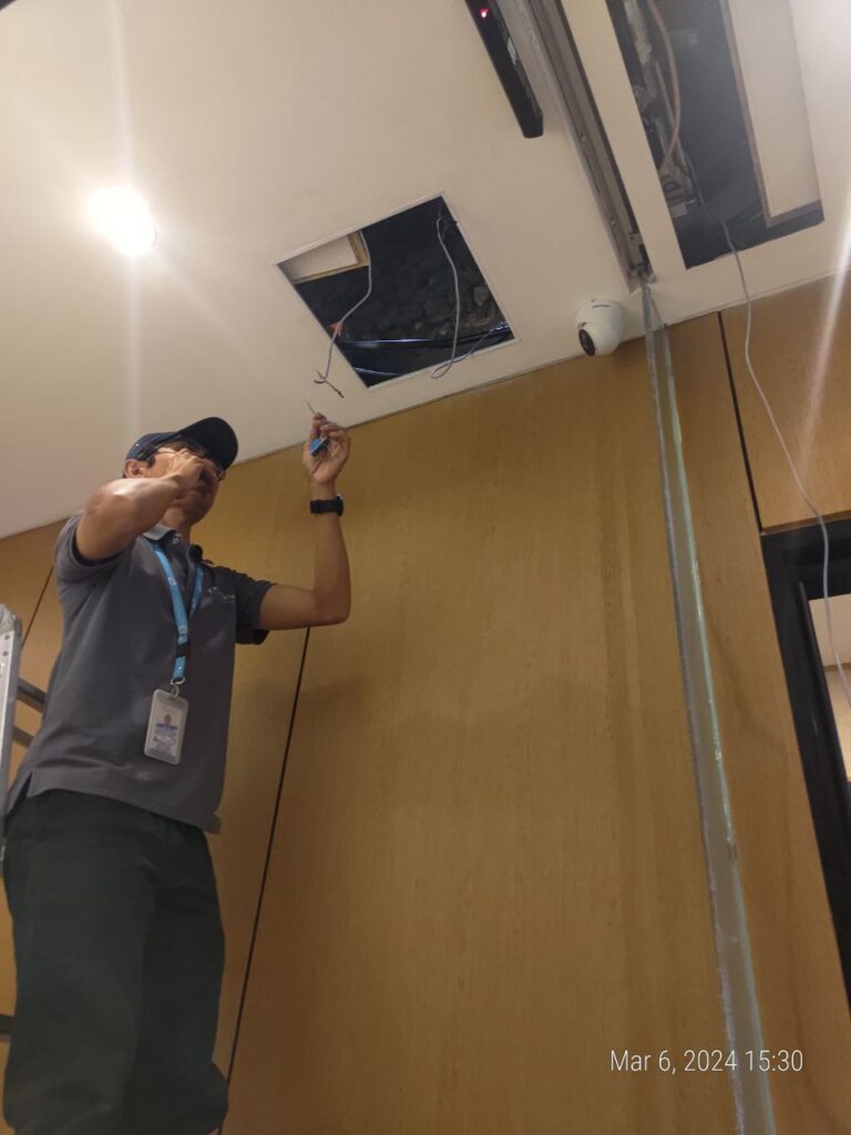 3. Pengabelan Structured Cabling: Penarikan kabel LAN (UTP Cat6) dari ruang server/switch ke setiap titik Access Point dengan manajemen kabel yang rapi.