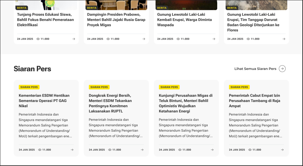 Proyek ini berfokus pada transformasi digital portal resmi Kementerian Energi dan Sumber Daya Mineral (ESDM). Tantangan utamanya adalah mengganti sistem manajemen konten (CMS) bawaan yang kaku dengan Custom CMS yang didevelop khusus oleh Sagara untuk meningkatkan fleksibilitas, keamanan, dan efisiensi pengelolaan data publik. Dalam penyusunan ide dan perancangan antarmuka, tim menggunakan metodologi Design Thinking untuk memastikan solusi yang dihasilkan benar-benar menjawab kebutuhan pengguna (citizen-centric).
